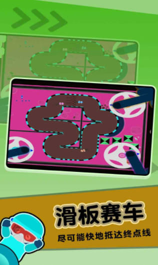 控制角色驾驶滑板在不同的区域移动,需要躲避关卡地图陷阱才能安全到达终点