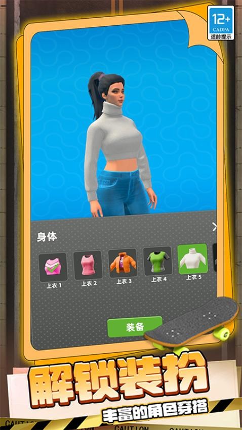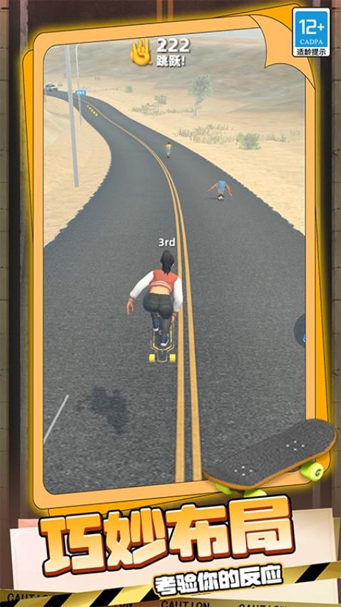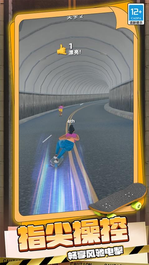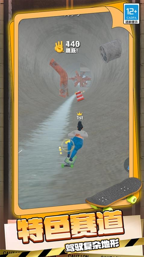 在游戏中,玩家可以对自己的滑板进行升级改装,提升最高速度、加速和操控性能,打造专属神车。游戏设置了特色赛道,包含复杂地形,考验玩家的操控技巧。玩家还能解锁丰富的角色装扮,为角色换上不同风格的上衣等服饰。在赛道上,玩家需要巧妙布局路线,快速反应躲避障碍,享受指尖操控带来的风驰电掣之感,尽情展现滑板技巧。