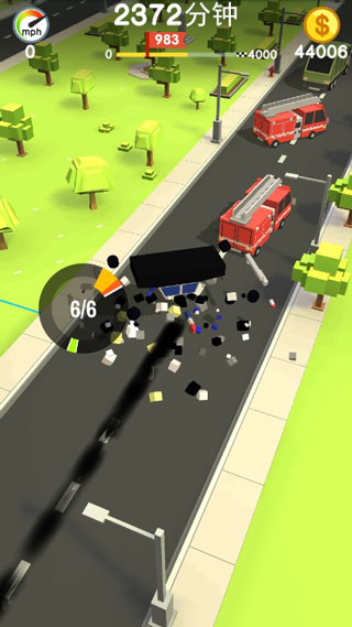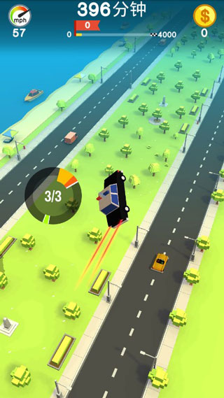 总体来说游戏的难度并不是特别的大,只需要把控好警车每次加速环在圈上的点,过短、过久的加速会让汽车崩溃,而只有合适的进行多次加速才能让你拥有一飞冲天的速度,从而抵达更远的距离。