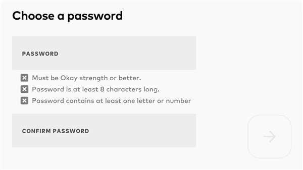 设置账号密码,确保上下两行密码一致,密码至少需要8个字符,并且至少包含一个英文字母。