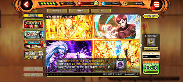 生存挑战不宜过早挑战,首日稍作等待,待阵容略有成型后再投入,避免战力不足导致资源浪费;生存商城首选迈特凯,余量可依个人偏好选择一尾鸣人或轮回石。