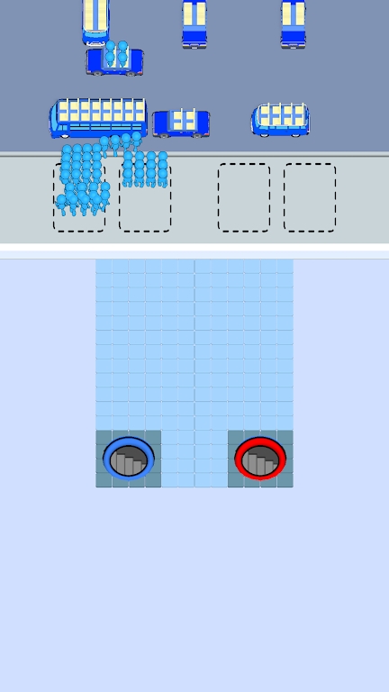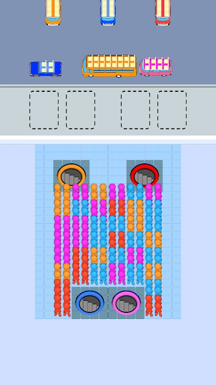 玩法是通过点击屏幕下方不同颜色的洞,来收集对应颜色的乘客,并引导他们上车。