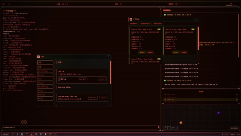 准备好建立自己的种子帝国了吗?破解软件,管理服务器,潜入黑市交易,智胜当局——一切都在2000年代的阴影下。在这个基于终端的策略模拟游戏中,在风险与回报之间起舞。成为数字传奇,或失去一切!