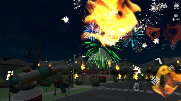 3、进入地图,现在正式开始教大家烟花模拟器这些按键功能:屏幕左边是移动,右边的按钮可以捡起烟花、摆放烟花、拿出点火器点火、跳跃,然后就是右上角的烟花商店按钮。