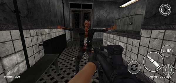 3、在游戏中玩家将利用手中的武器去击杀僵尸,左边屏幕控制移动,右边为换弹、射击、跳跃、瞄准按键