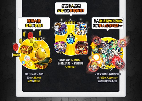 另外游戏支持四人同乐游戏玩法,透过游戏的连线系统,玩家可以拿出旗下最强力的队员,与最多三名好友组队一同攻略关卡。值得注意的是,某些特殊的角色还限定必须透过连线关卡的方式取得,加深玩家与其他好友一同游玩的动力!