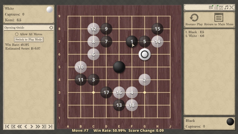 游戏采用3D画面呈现棋盘与棋子,视角灵活可调,整体风格简洁清晰,专注于突出围棋局部的细节。界面设计注重功能性,实时显示的胜率估算、资源状态等信息易于玩家查看。虽然画面不以华丽特效见长,但其直观的可视化设计有效提升了围棋对弈的沉浸感和策略规划的便捷性。