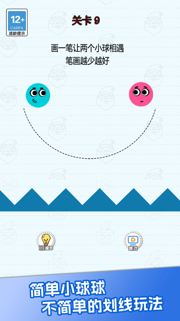 如下图所示,进入关卡之后玩家需要画出线条,让两个球球能够在下坠之后成功碰撞到一起即可闯关。