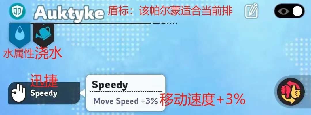 被收服的帕尔蒙各有脾性:Graffitty是位行动派猫工,从翻土到覆膜一气呵成,玉米地在它爪下井然有序;Auktyke则是一只企鹅形单功能设备,只管浇水,喷完水就踱去阴影里发呆,连甩水的动作都透着一股心安理得的敷衍。两者词条差异一目了然,一个写满全能,一个刻着专精且仅此一项。