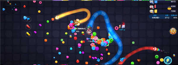 包围刹——以长度兑现统治力当你的蛇长达到地图周长1/3以上,即可启动围猎战术:用身体划出封闭区域,将目标困于内圈。他无路可退,唯有自撞身亡——轻松收割糖果与积分。