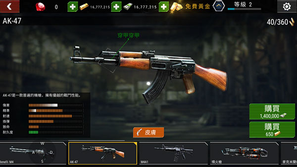 游戏中配有第一人称射击游戏中所有常见枪型,并且随着随着难度的增加,你可以在游戏商店中可以购买更为高级强劲的战斗武器,如AK47、M4A1等等,每支武器都有自己独特的属性值,玩家们还可以进行对其升级,从而更好的帮助玩家们完成任务。