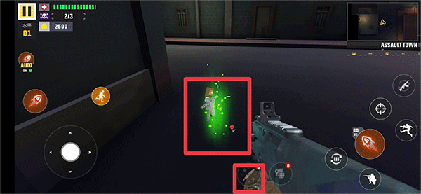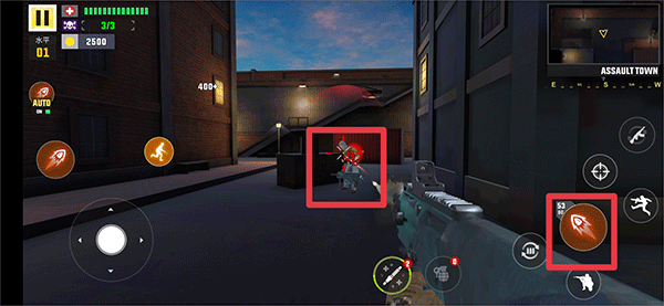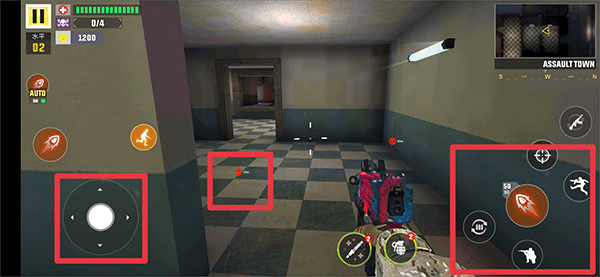 4、进入游戏后,左下角轮盘控制觉得的移动,右边为换弹,射击,蹲,跳等,然后玩家根据游戏中的红色标识去寻找敌人的位置