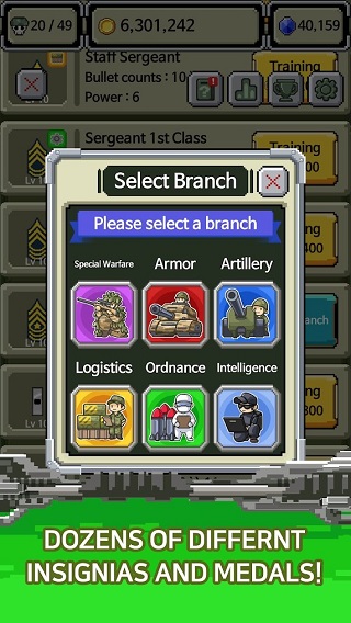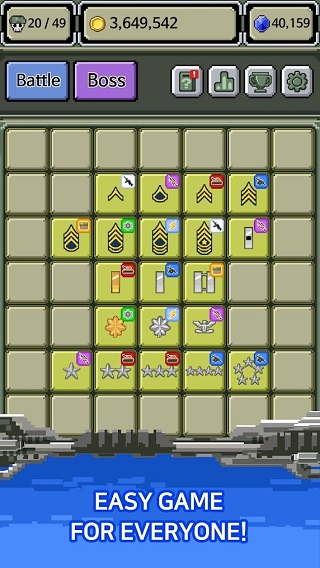 Rank Insignia - Super Explosion也叫军衔徽章,这是一款由海外知名游戏厂商 Lucky Chan Games 推出的策略休闲类游戏,经典的像素画风,不免让人回忆起年少时玩过的游戏机系列,在这里玩家作为最高指挥官,需要考虑的不止是兵种的升级进阶,还要建造各类建筑,训练更强大的士兵,歼敌闯关!士兵升级融合了当下十分流行的合成玩法,在战斗开始之前,玩家可通过招募来完成士兵的招募,将相同军衔的徽章进行合成便可得到一名全新的士兵,士兵等级越高,火力越强,不断的提升士兵等级,可以更快的获取战斗胜利!但徽章等级到达10级,可对兵种进行分支培养,后勤、军械、智力、炮兵、盔甲兵等等,数十种分支机构的培养升级,大大提升了游戏玩法的丰富性,并且这也是玩家快捷获胜的关键所在。此外,在军衔徽章游戏中除了兵种培养,想要快速提升战力的方法还有训练和升级,训练包括子弹数量、力量,通过以上的强化方式,用更强大的火力扫荡你的敌人,缓解压力,轻松休闲,如有感兴趣的玩家不妨赶紧来试试吧!