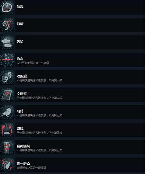 4、主线成就(如不使用快进/快退听完五关剧情)与彩蛋成就(如“幻听”“妄想”)鼓励玩家多周目挑战。