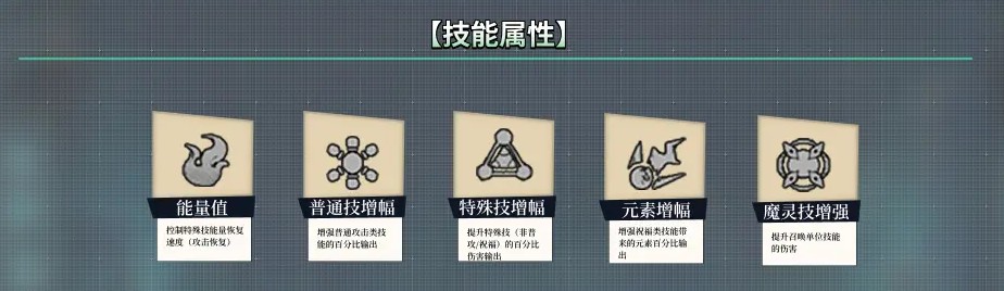 增幅体系:【普通技】、【特殊技】、【元素】(如火 / 冰 / 雷)、【魔灵技】(召唤单位)分别享受独立的百分比加成。