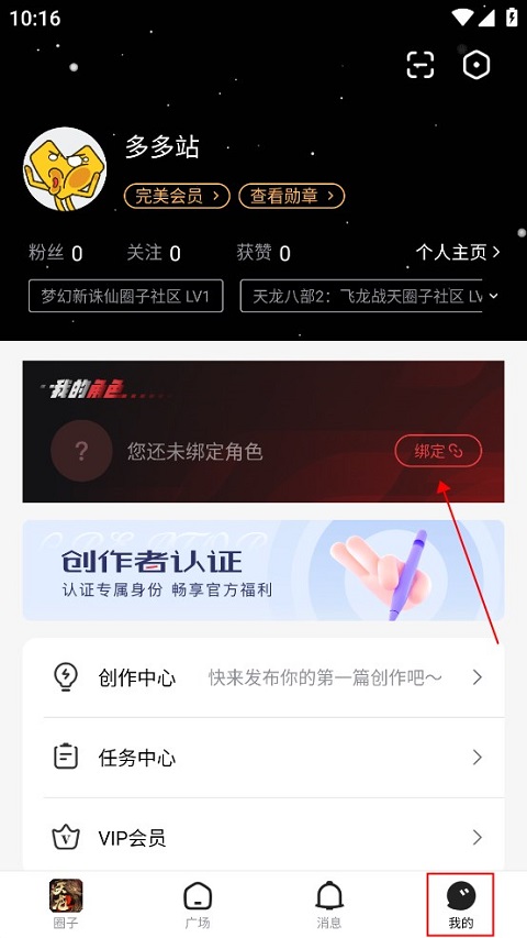 用户在完成注册登录后,在底部的导航栏中找到“我的”,在个人信息的下方有“我的角色”,在这里进行角色绑定。