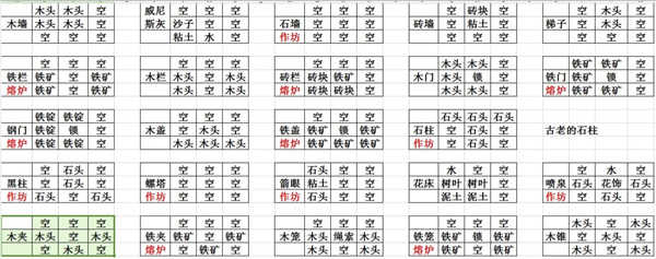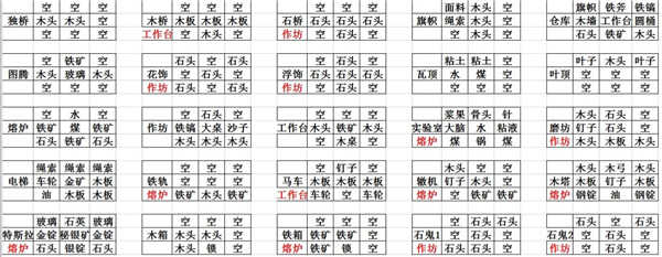 桥类、熔炉、作坊等核心设施的合成方式一目了然,涵盖从基础结构到高阶加工设备的全部配方。