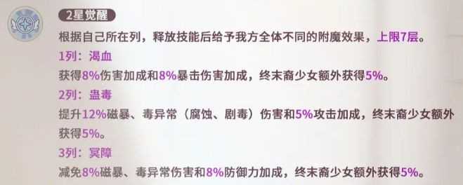 二星觉醒赋予卡莲站位即职能的独特机制:前排侧重直伤增益,中排专注间伤强化,后排主司生存加固。终末裔身份带来额外加成,虽当前仅卡莲一人适用,但其机制已预留扩展空间。
