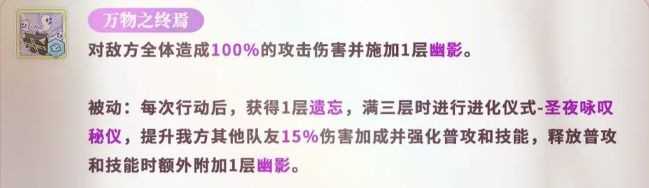 群体技万物之终焉将【幽影】的压制力扩散至全场,同时激活被动遗忘一个与【幽影】镜像共生的状态:前者侵蚀敌人,后者庇护己方。它不仅能清除异常,更在关键时刻成为净化链的核心节点,尤其与【清心印记】搭配时,异常驱散效率跃升至战术级水准。