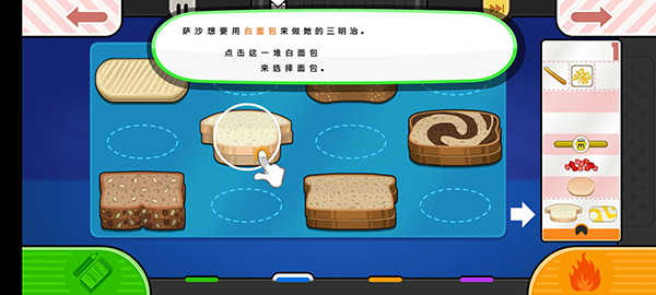 比如萨沙点了一份白面包三明治,只需轻触原料堆中的白面包图标,便能将其选中作为基底。