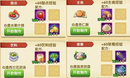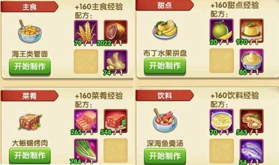 美食按主食、菜肴、甜点、饮料四大类划分,统一存入冰箱。注意冰箱容量有限,切勿盲目量产单一品类,否则容易卡住后续制作流程。合理规划库存空间,根据当前食材富余情况动态调整菜谱,才能让友好度成长始终顺畅无阻。
