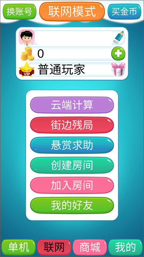 1、打开游戏,先进行实名认证操作,认证成功后进入到游戏主界面,游戏一共分为了四个部分:单机、联网、商城以及我的,在“联网”界面中可以看到云端计算、街边残局、悬赏求助、创建房间、加入房间以及我的好友,先点击我的好友。