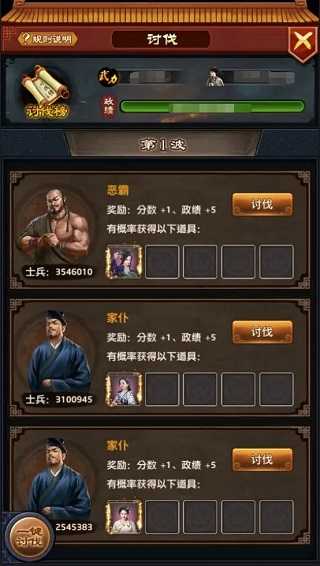 6、讨伐(需先通关关卡80:化险为夷):每一波固定获得5点政绩