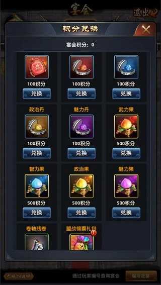 宴请宾客,酣畅淋漓。开启宴会,邀请小伙伴来参与,可以获得积分,参与的小伙伴也是相同。积分则是可以兑换政绩礼包,随机盟战锦囊等道具。