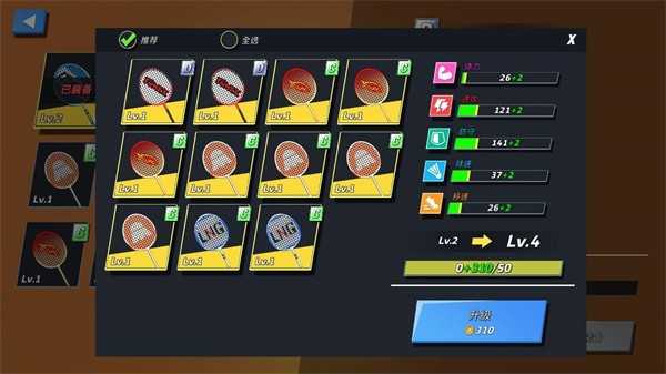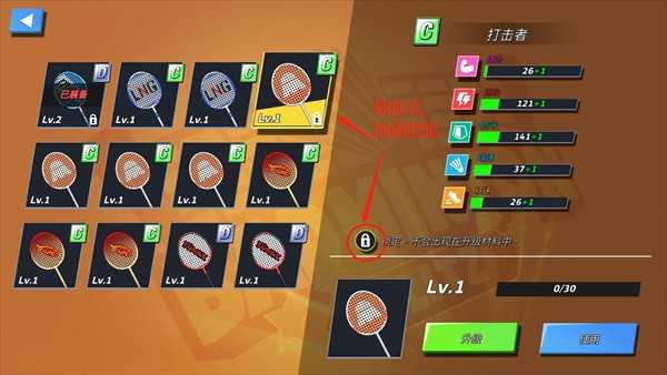 球拍升级依赖经验转化,低阶球拍可作为养料喂给主力装备。务必记得锁定心仪球拍,防止误操作导致珍贵装备被分解。