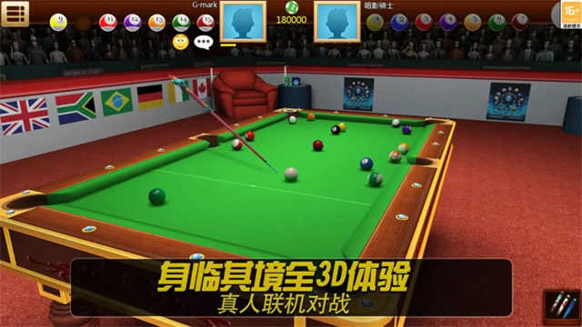 挑战网络上来自全世界的朋友在3D台球世界对战,从草根轻松成长为台球明星。