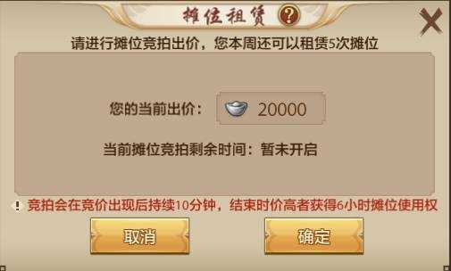 【竞拍规则】点击空闲摊位出价→首位出价后开启10分钟倒计时→期间可多次加价→价高者得6小时使用权→每周限用5次,每次独立扣除次数。
