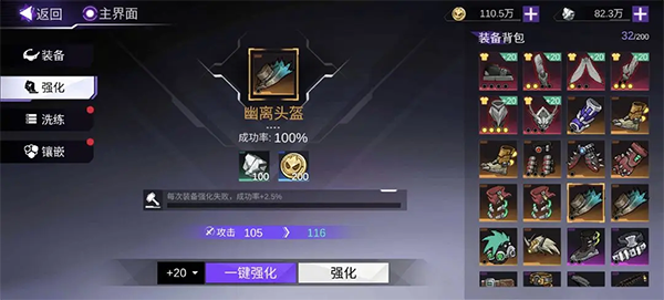 装备强化与穿戴:在主界面点击【装备】按钮进入装备界面,点击【一键装备】穿戴装备,然后点击【强化】到强化界面,选择需要强化的装备进行点击,强化后可提升武装属性,增强整体战力。