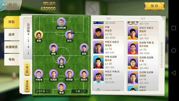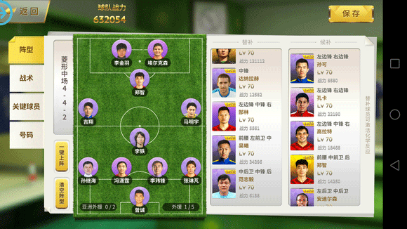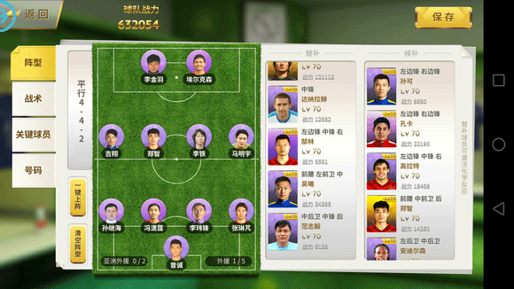 战术:基本上的战术是14511,用这个战术主要是为了让吉祥和孙可更多的参与到进攻中来,任意球和角球给吉祥,点球给达10