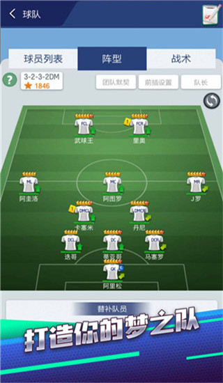 游戏中玩家可以在为球队定制阵型和战术,而且可以在比赛中根据对手的情况进行实时的调整。游戏内置了大量常用阵型,玩家可以从中挑选并快速切换。另外也可以长按球员后,将其拖动至其他位置,做出常用阵型之外的自定义阵型。