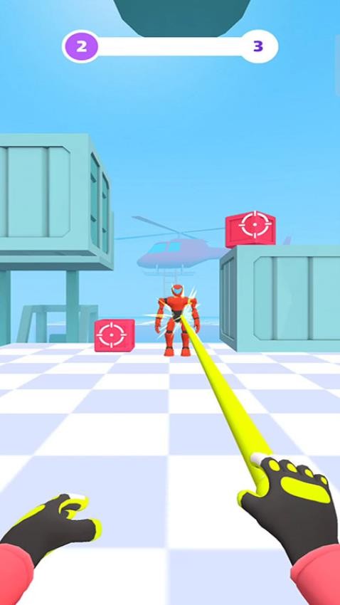 1、使用黄色的绳索来攻击前方的超人,并且还需缠绕粉色箱子攻击他们。