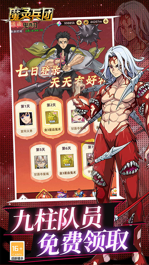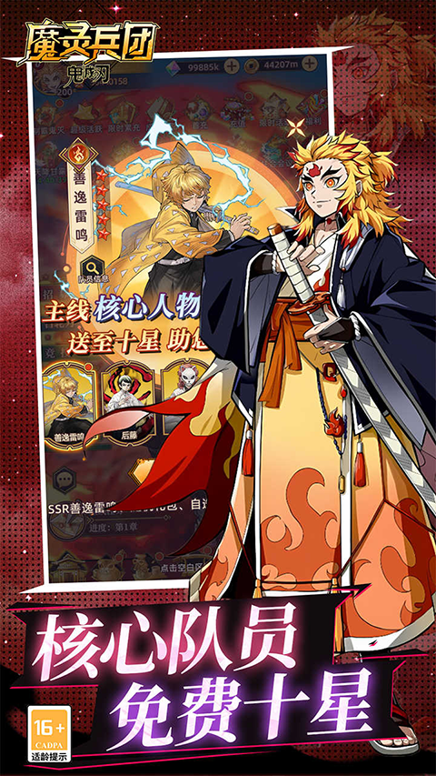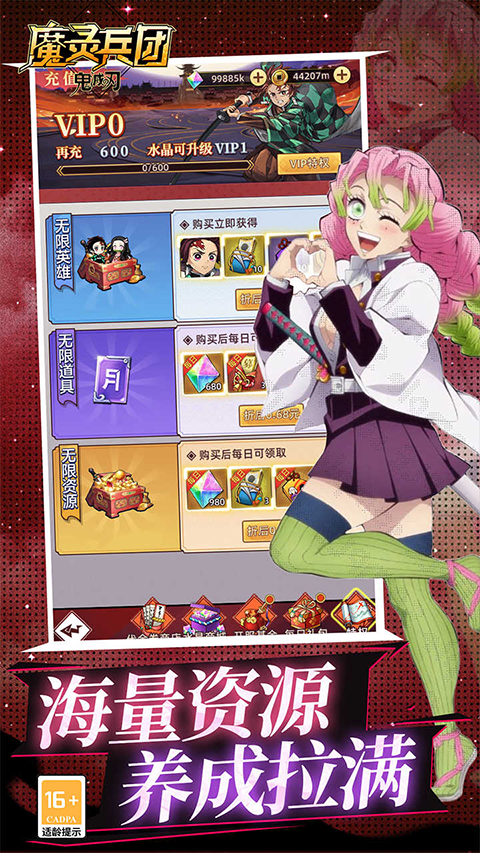 魔灵兵团折扣版是一款以鬼灭动漫改编的卡牌策略闯关游戏,此版本充值0.1折,而且上线就送6480代金券以及九柱队员免费领取,帮助玩家轻松消灭一切鬼怪,获得畅快的游戏体验。在魔灵兵团游戏中,玩家将来到鬼灭世界,你可以招募众多原著动漫角色,如炭治郎、富冈义勇、蝴蝶忍、炼狱杏寿郎等,他们各种有着不同的技能和定位,玩家可根据自己的喜好,以及关卡内敌人特性来搭配养成,以此更好地消灭鬼怪,取得战斗的胜利。感兴趣的朋友还在等什么,快来下载体验吧!