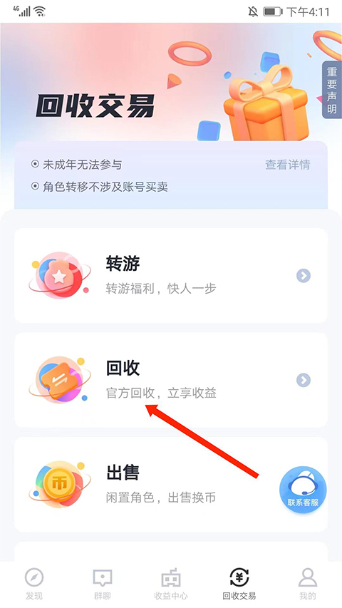 2、进入【回收交易】界面,选择【回收】选项,