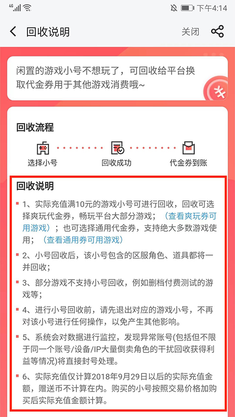 4、选择需要的小号在66手游进行回收就可以删除小号了,同时还能换取代金券用于其他游戏的消费,详情可查看“回收说明”。