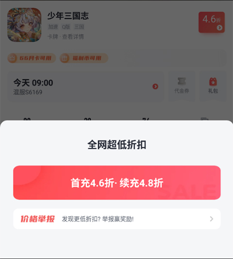 3、进入【游戏详情】界面,可看到显示5折折扣充值,提示“66月卡可用”、“福利币可用”、“转游福利可用”、还可以领取代金券,进入游戏后就可以开始折扣充值了。