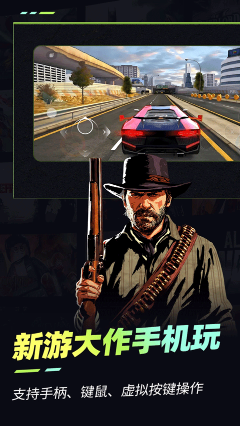 随时随地,海量游戏免费畅玩!、绝地求生、 全面战争模拟器、奥特曼进化格斗、地平线4、 看门狗、方舟、火影忍者究极风暴4、赛博朋克2077、 正当防卫系列、荒野大镖客2、育碧全家桶、模拟人生4、古墓丽影系列,策略类、休闲类、角色扮演类、三国题材、 对战模式等等网游3A单机大作通通都有!