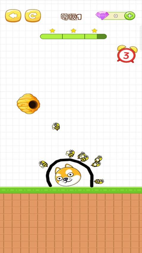 1、在等级1中,你需要画一条弯曲的线将狗头包裹起来,蜜蜂便不能接近狗头。