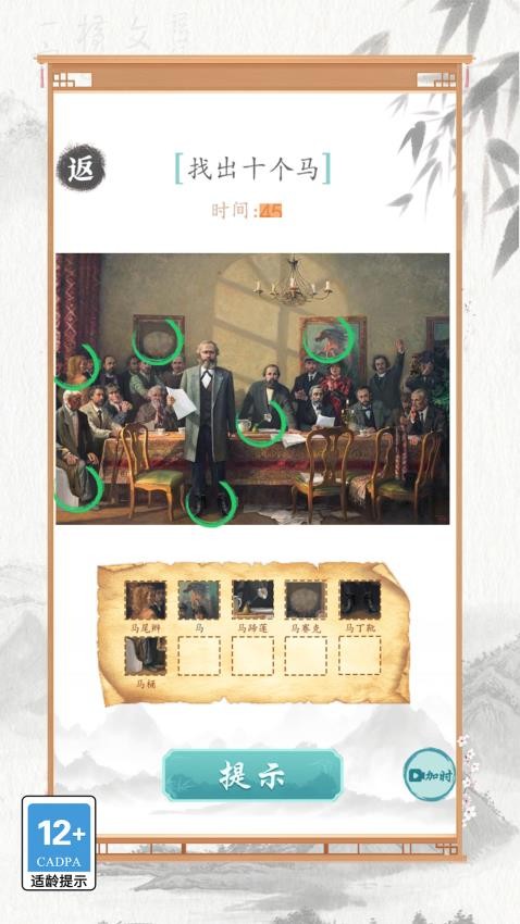 3、将图片中和“马”相关的内容全部找到,需要找到十个“马”,例如马赛克、马丁靴、马尾辫