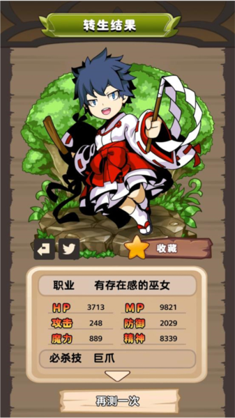 3、10道题答完大家就可以看见这次转生的角色是什么样的了,大家可以把自己喜欢的转生结果收藏起来展示给自己的小伙伴们观看。