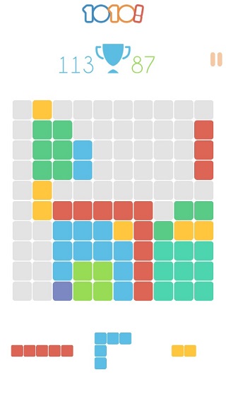 在这款游戏中,记得最需要的就是想尽一切可能的消除,只要看到一整排缺上一个,那么想办法立马堵上,然后消除,因为系统貌似有个设置,就是越到屏幕之上没有空隙的情况下,就会出现很多3*3的大格子或者是1*5的竖排/横排,然后无处安放。
