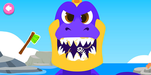 5、在刷牙游戏中,玩家拖动牙刷,将恐龙口腔内的污渍全部清理干净即可过关。