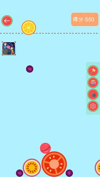 2、游戏画面上分每次将出现各种各样的水果,玩家要做的就是选择一条纵坐标将这个水果扔下去