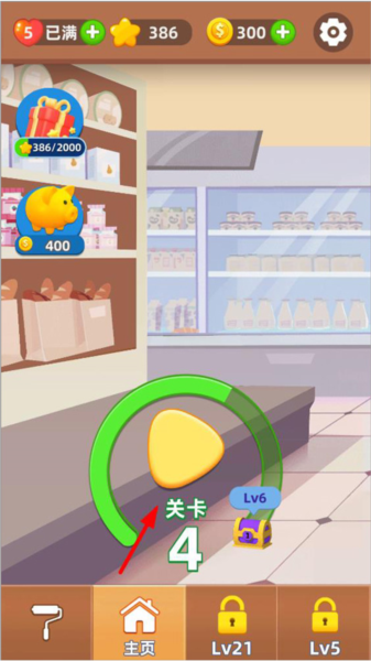 1、玩家打开游戏进入游戏主页,在该页面玩家可以查看体力、金币和星星,点击关卡开始游戏;