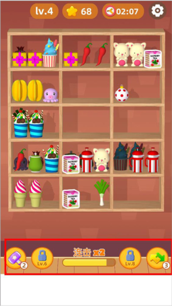 2、进入游戏,玩家需要找到相同的物品把他们放到一个货架上即可消除;