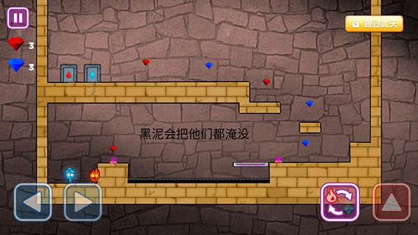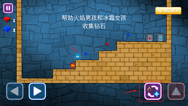 3、在游戏中玩家需要操控冰和火过关,利用左右按键操控角色的移动,右边为切换角色和跳跃按键