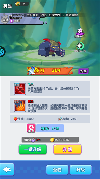 怒气技能:【狂怒】拍拍熊陷入狂怒,如暴风骤雨一般打击前方的敌人,连续攻击5次,造成额外10%伤害,不消耗普攻次数。